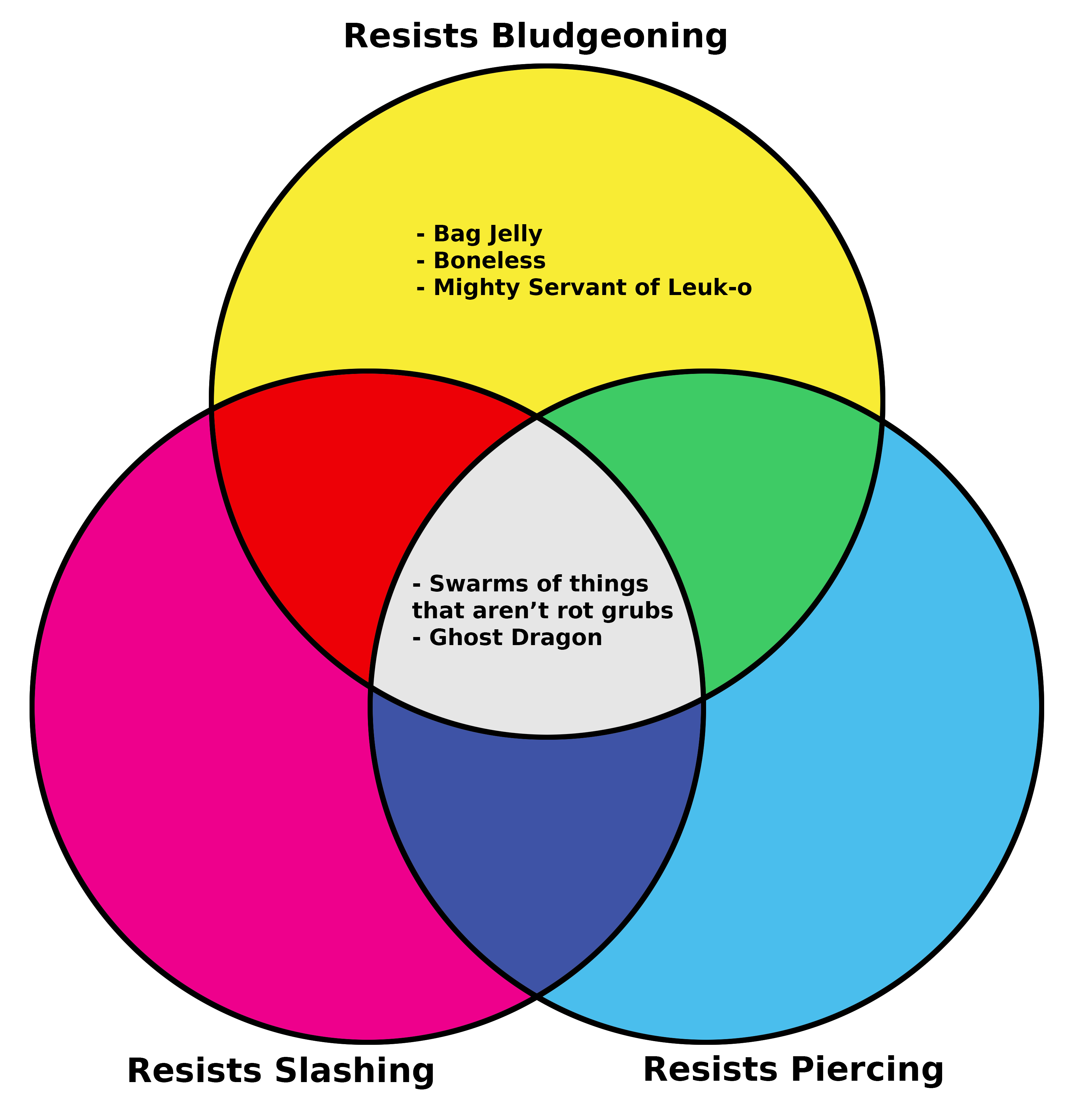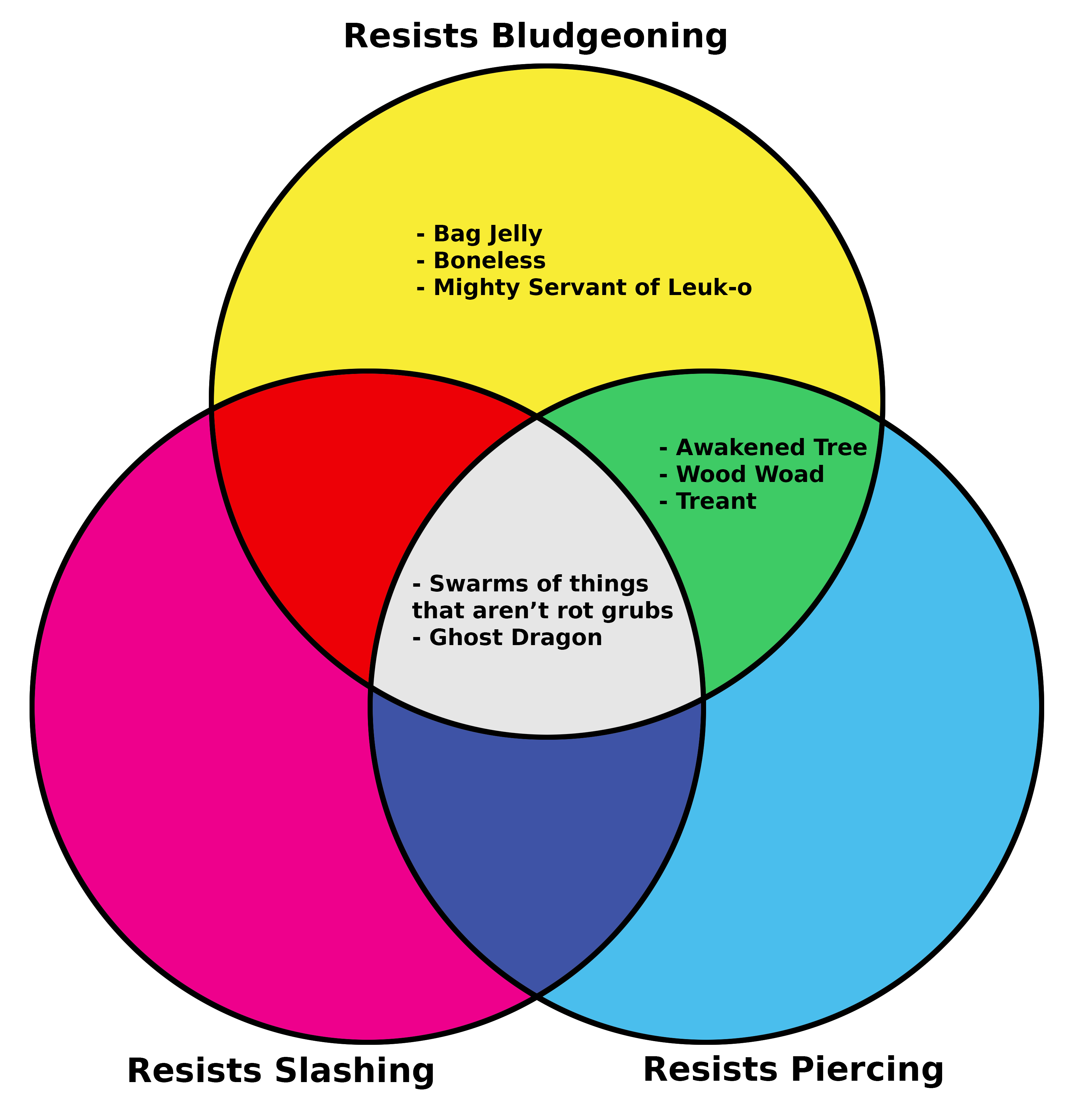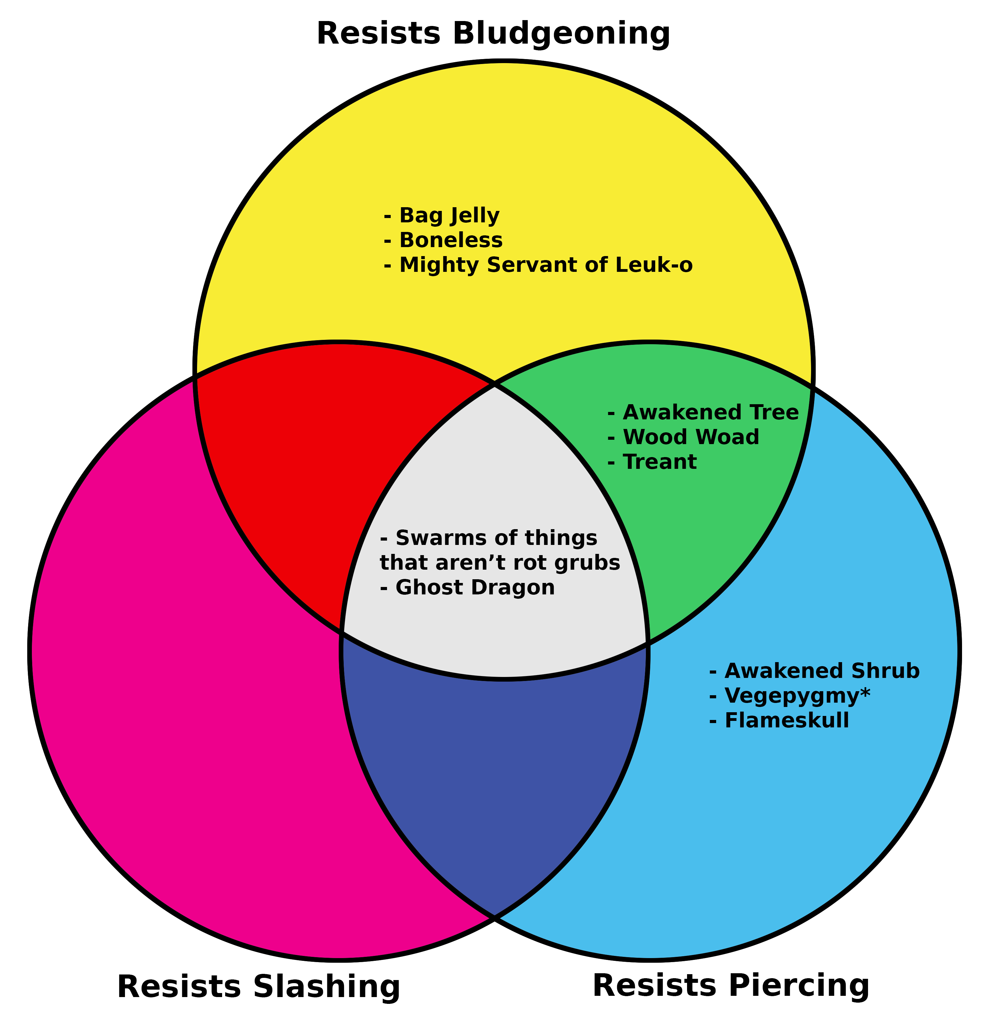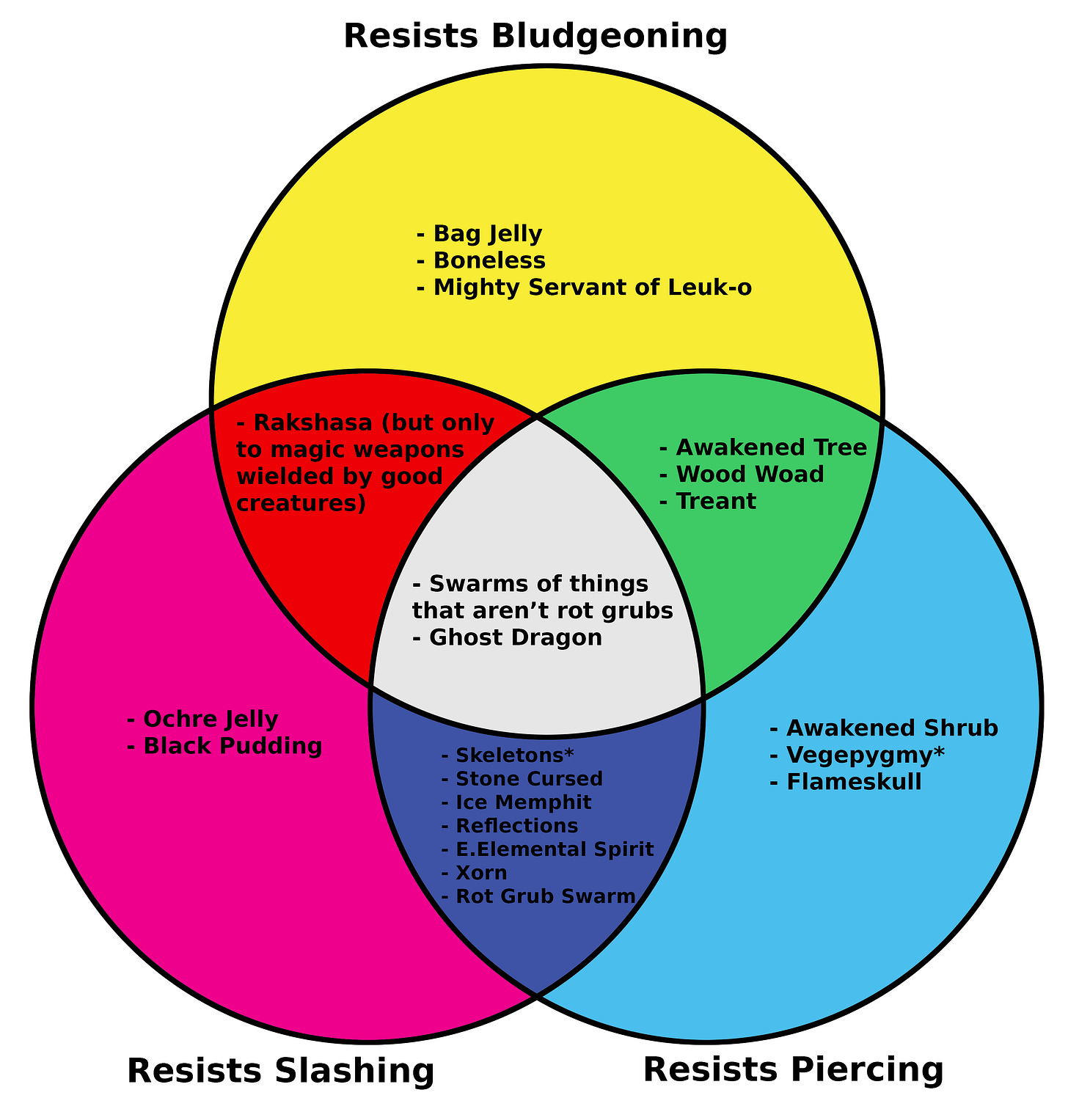 I was worried one section of this diagram would be totally empty but there is in fact one monster in the entire corpus of everything written for fifth edition, including adventures, supplements, and content of dubious officialness, which is vulnerable to piercing damage. Can you guess who it is?