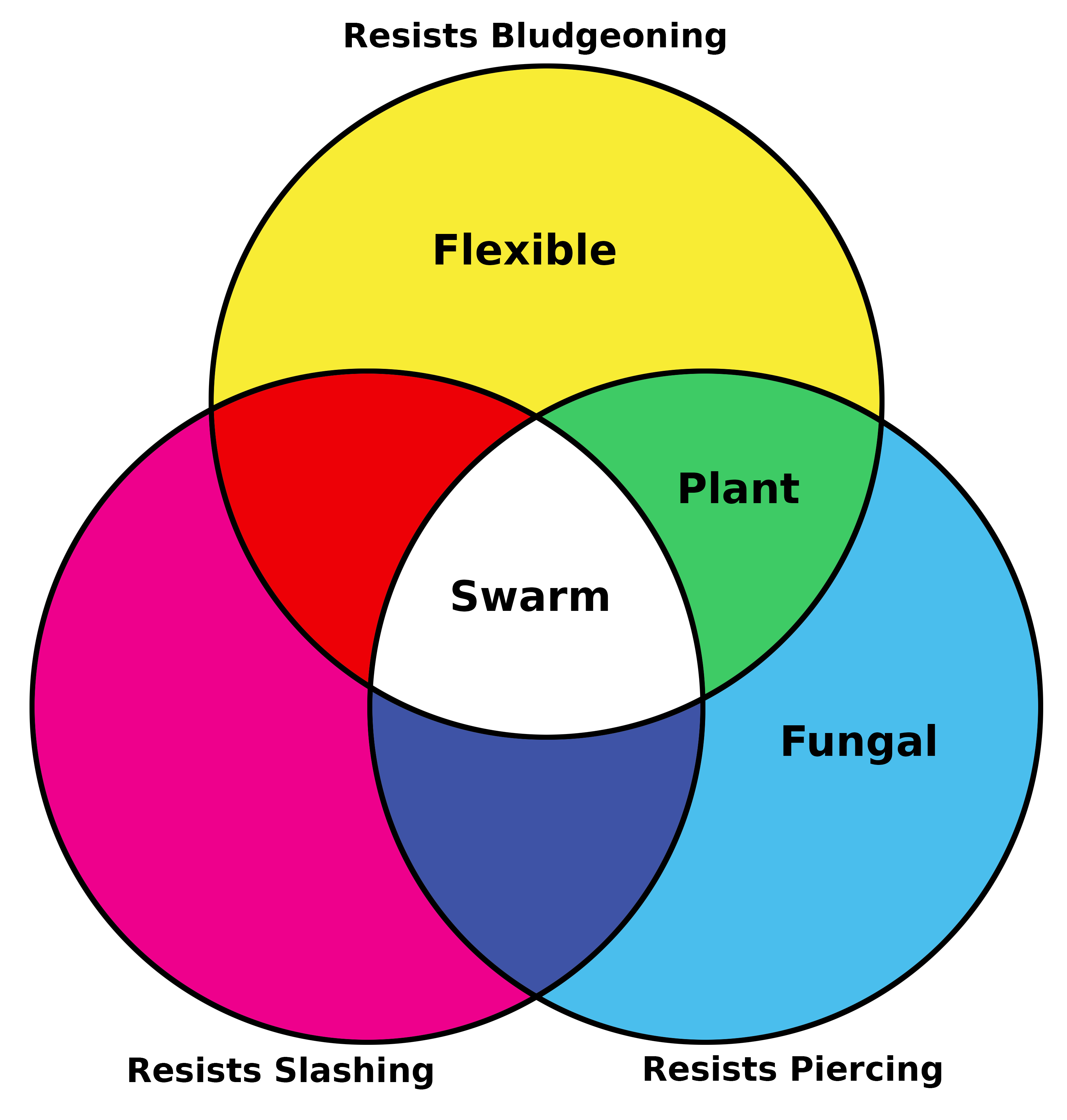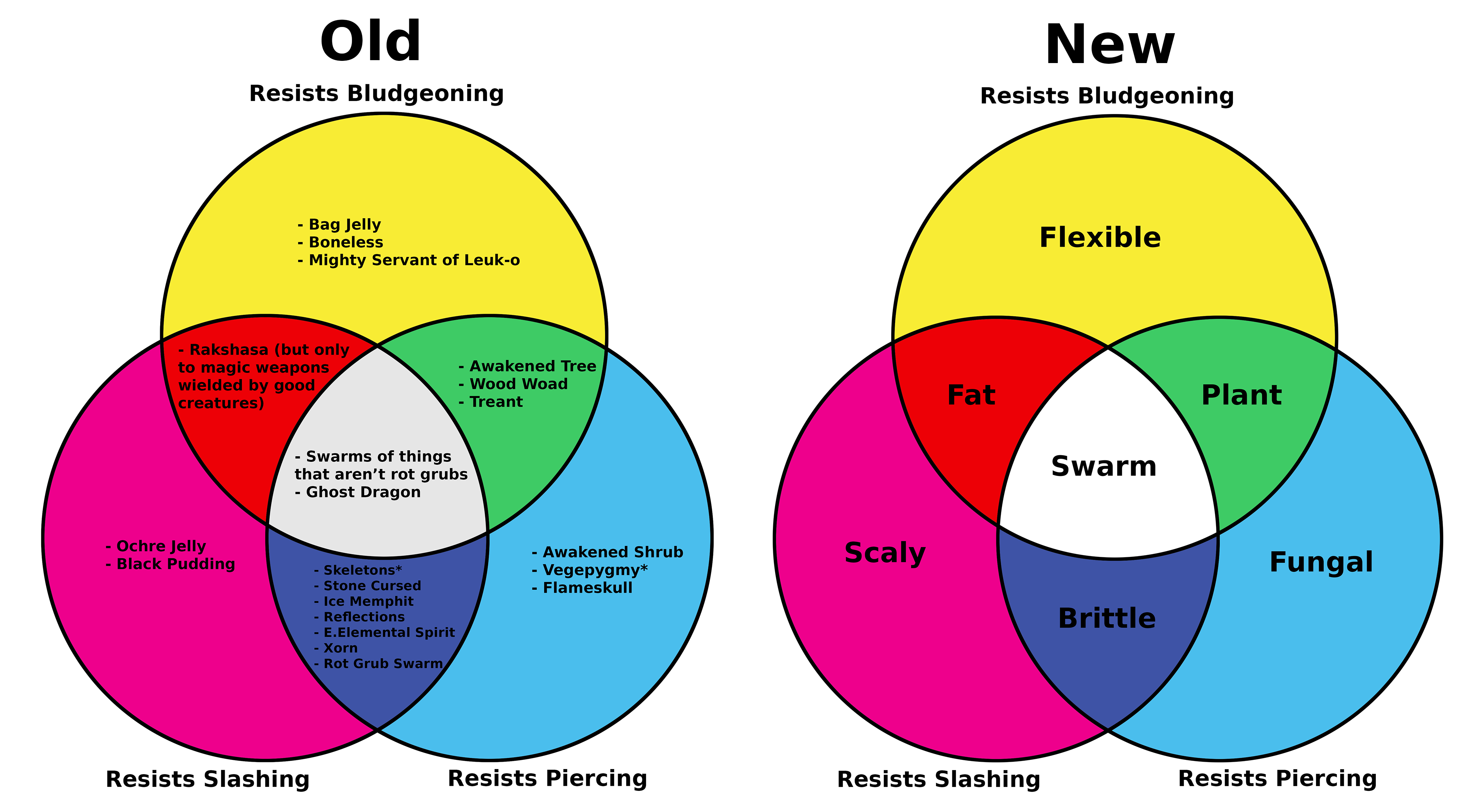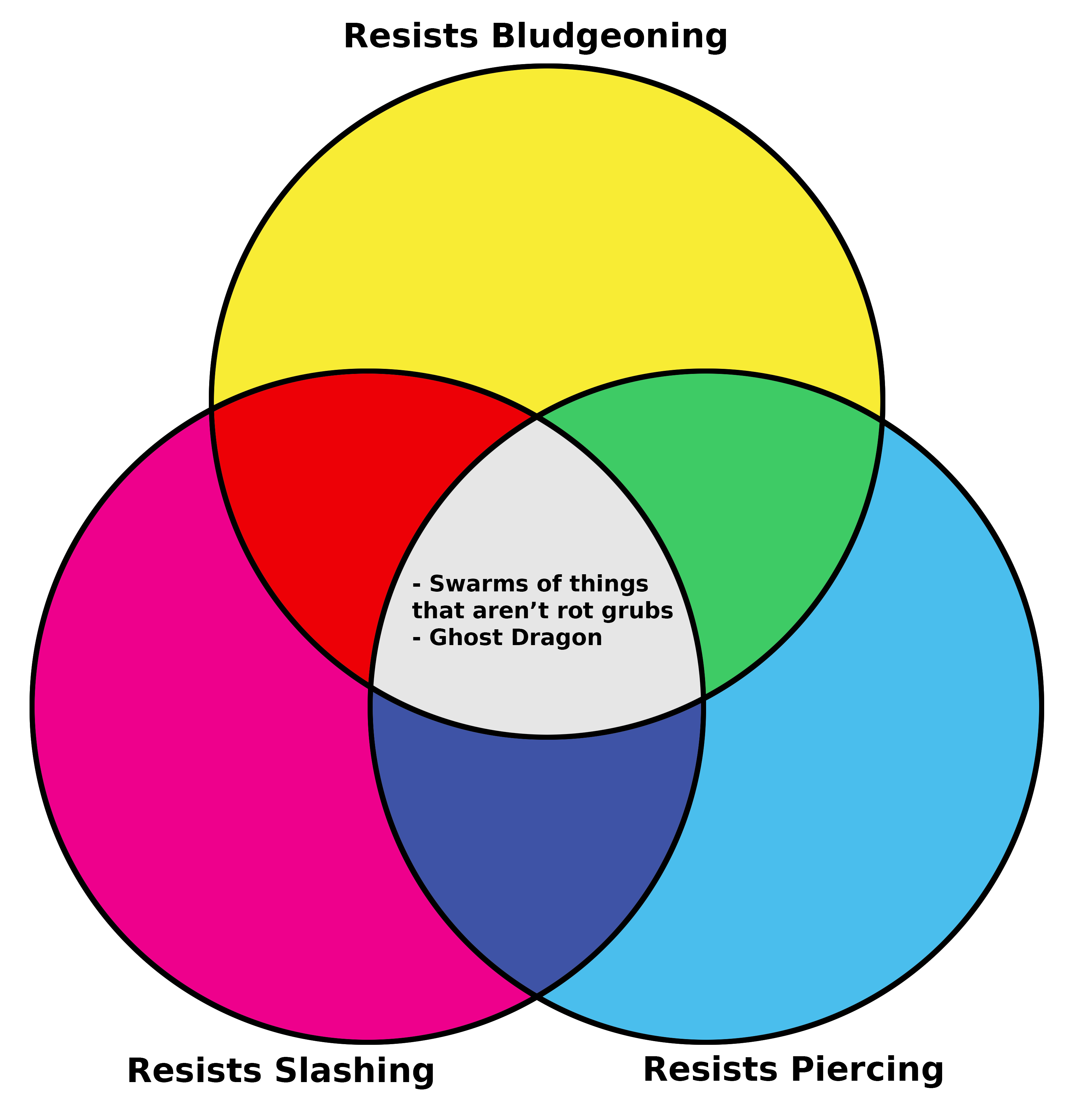 I was worried one section of this diagram would be totally empty but there is in fact one monster in the entire corpus of everything written for fifth edition, including adventures, supplements, and content of dubious officialness, which is vulnerable to piercing damage. Can you guess who it is?