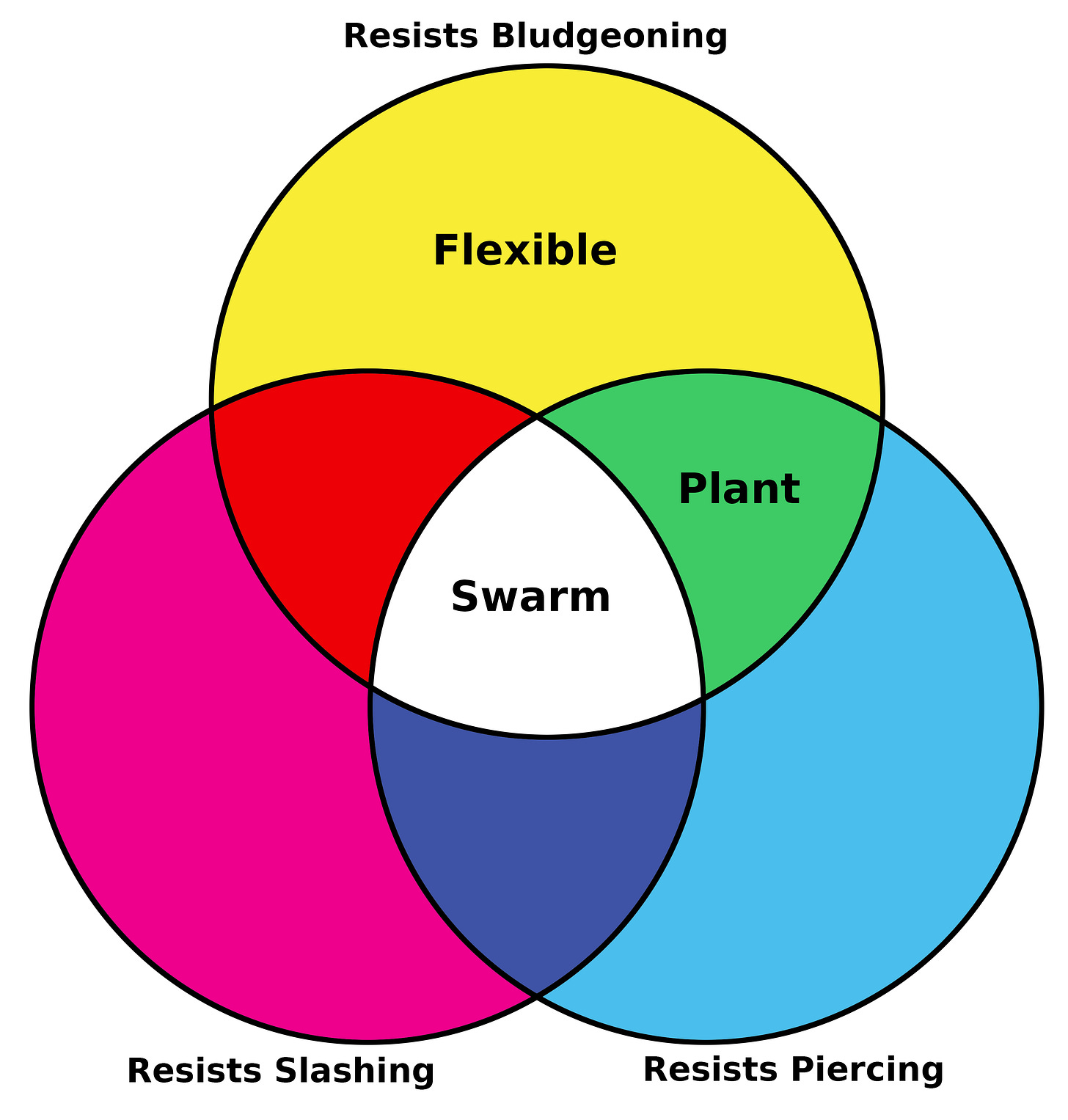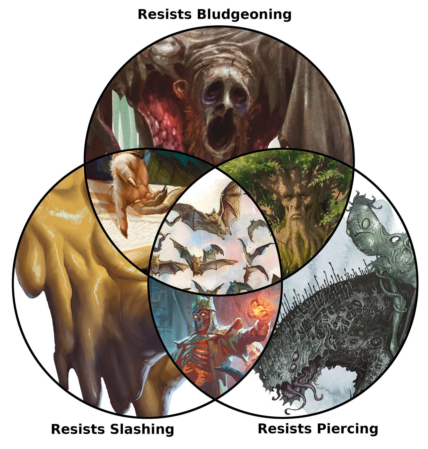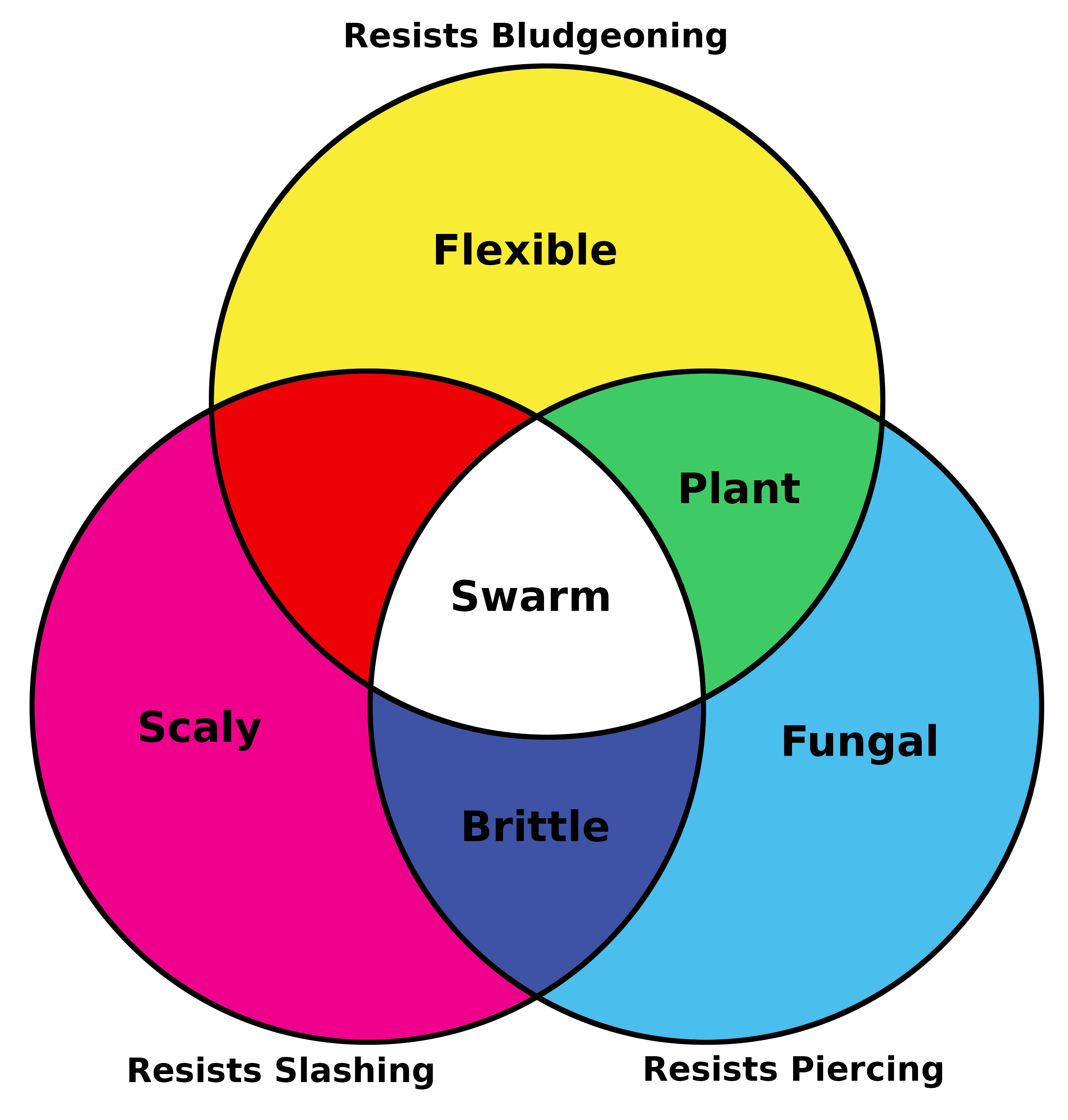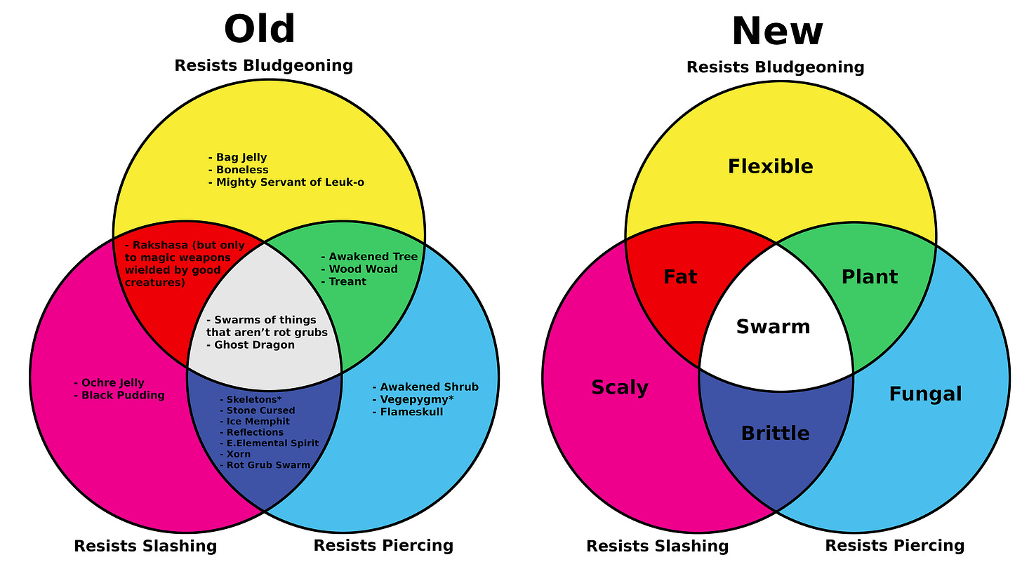 I was worried one section of this diagram would be totally empty but there is in fact one monster in the entire corpus of everything written for fifth edition, including adventures, supplements, and content of dubious officialness, which is vulnerable to piercing damage. Can you guess who it is?